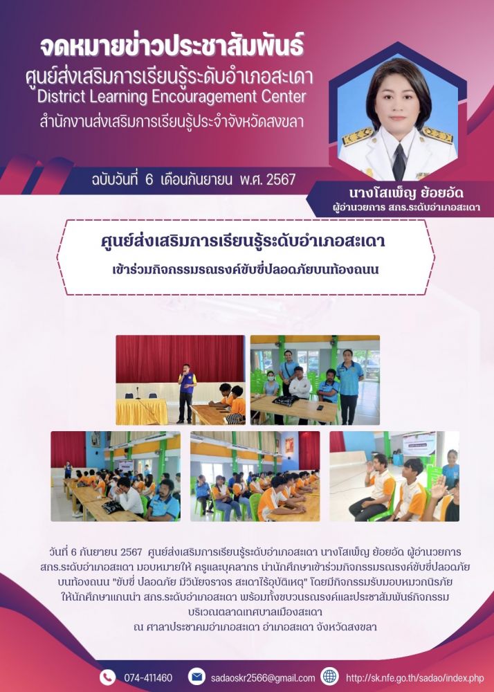 ศูนย์ส่งเสริมการเรียนรู้ระดับอำเภอสะเดา เข้าร่วมกิจกรรมรณรงค์ขับขี่ปลอดภัยบนท้องถนน