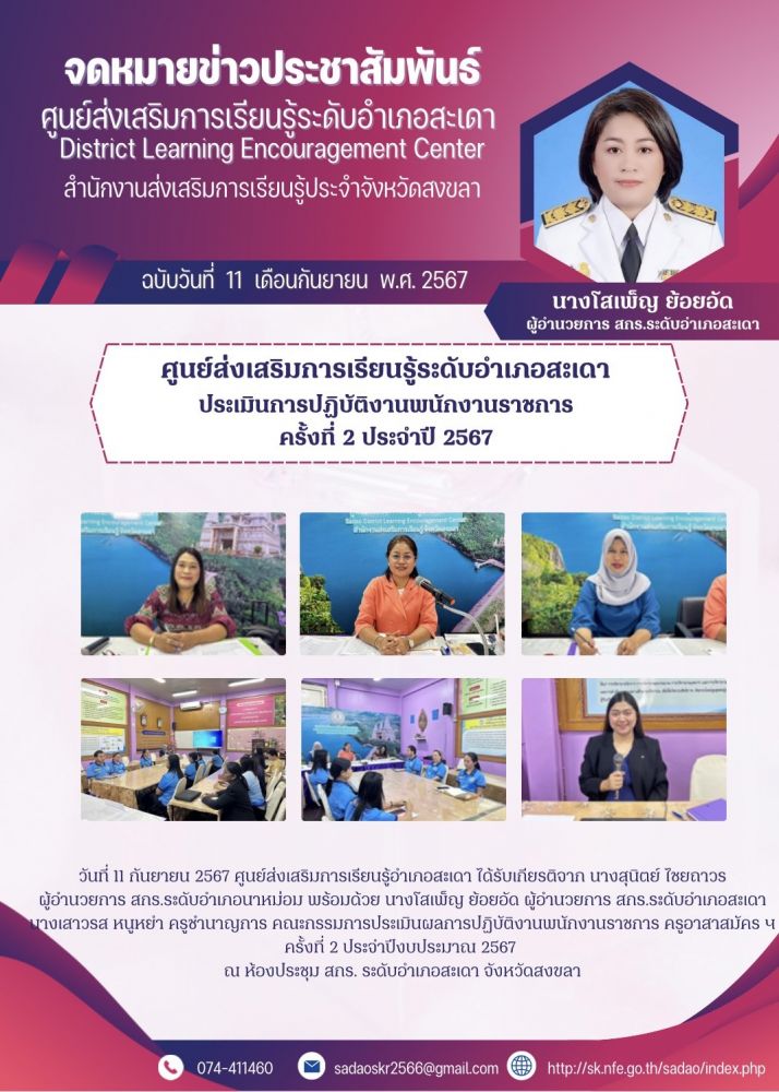 ศูนย์ส่งเสริมการเรียนรู้ระดับอำเภอสะเดา ประเมินการปฏิบัติงานพนักงานราชการ ครั้งที่ 2 ประจำปี 2567