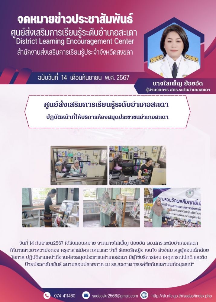 ศูนย์ส่งเสริมการเรียนรู้ระดับอำเภอสะเดา ปฏิบัติหน้าที่ให้บริการห้องสมุดประชาชนอำเภอสะเดา