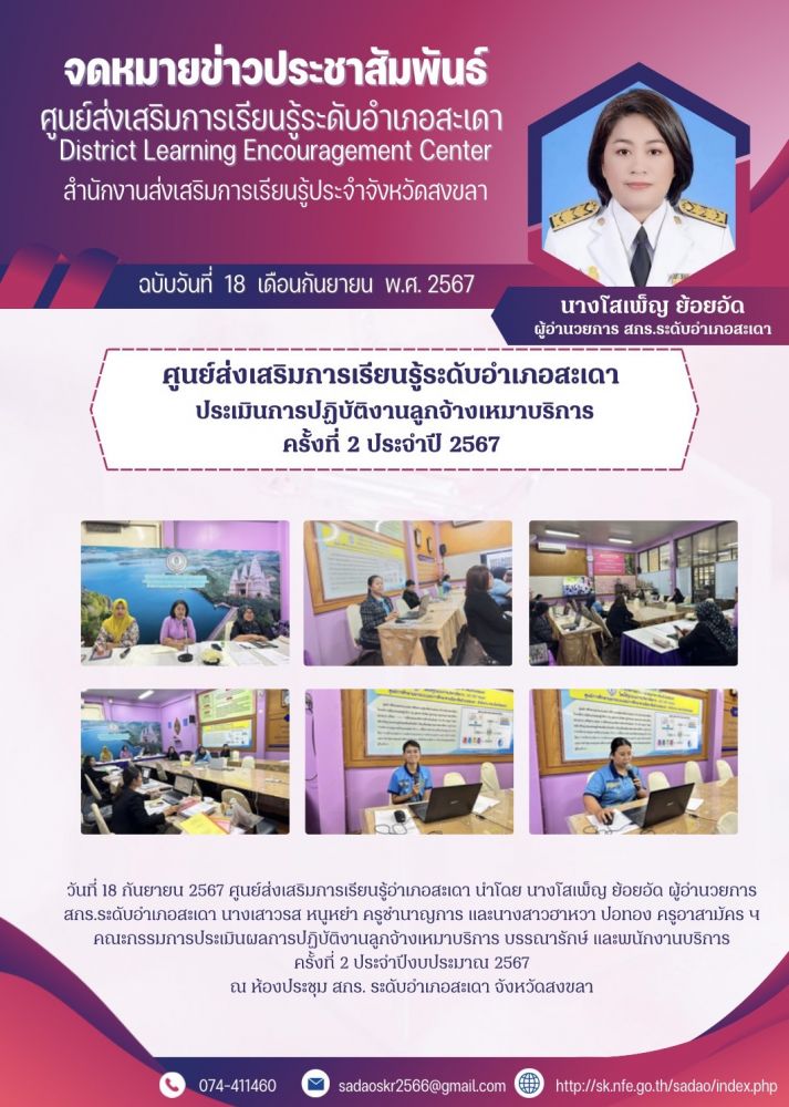 ศูนย์ส่งเสริมการเรียนรู้ระดับอำเภอสะเดา ประเมินการปฏิบัติงานลูกจ้างเหมาบริการ ครั้งที่ 2 ประจำปี 2567