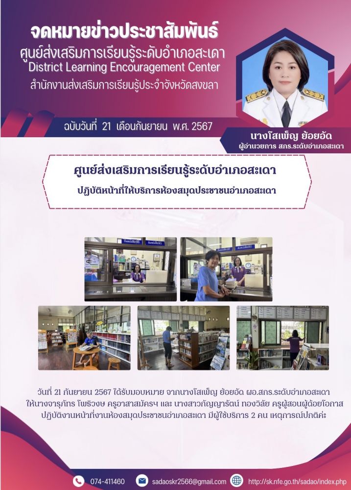 ศูนย์ส่งเสริมการเรียนรู้ระดับอำเภอสะเดา ปฏิบัติหน้าที่ให้บริการห้องสมุดประชาชนอำเภอสะเดา