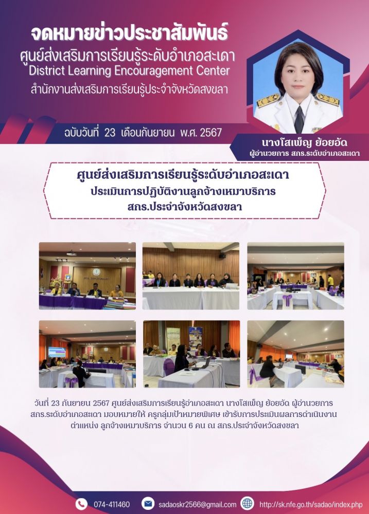 ศูนย์ส่งเสริมการเรียนรู้ระดับอำเภอสะเดา ประเมินการปฏิบัติงานลูกจ้างเหมาบริการ สกร.ประจำจังหวัดสงขลา