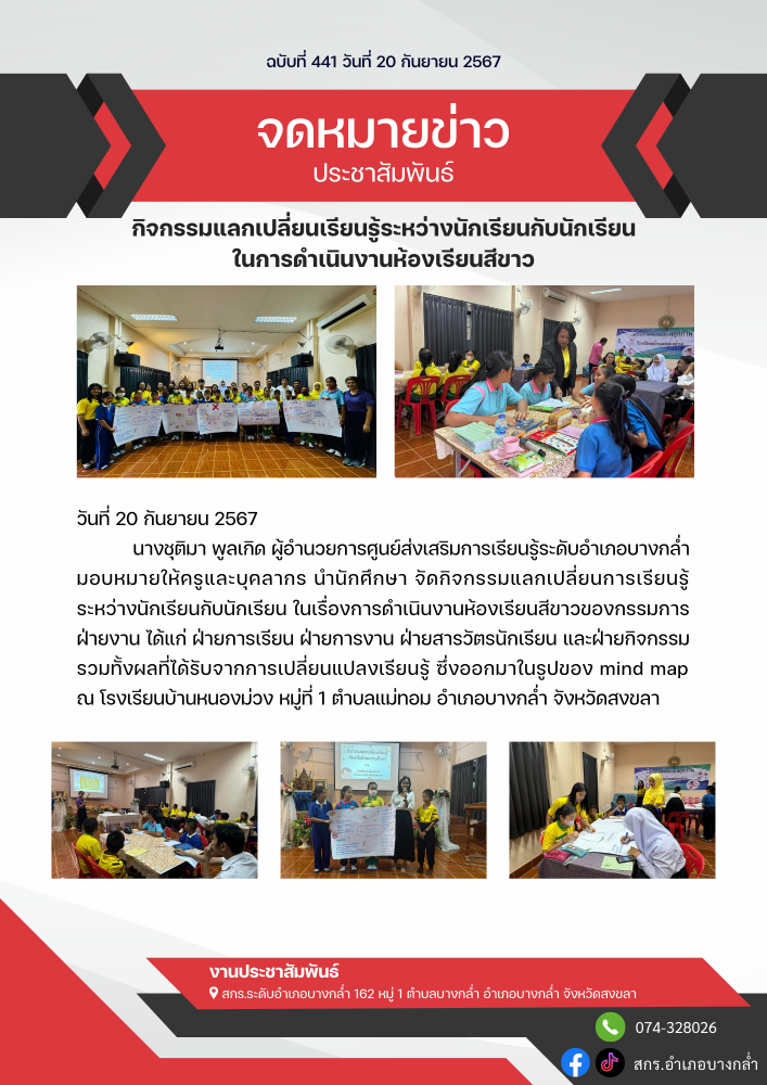 กิจกรรมแลกเปลี่ยนเรียนรู้ระหว่างนักเรียนกับนักเรียน ในการดำเนินงานห้องเรียนสีขาว