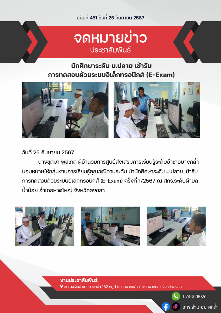 นักศึกษาสกร.ระดับอำเภอบางกล่ำ ระดับ ม.ปลาย เข้ารับ การทดสอบด้วยระบบอิเล็กทรอนิกส์ (E-Exam)