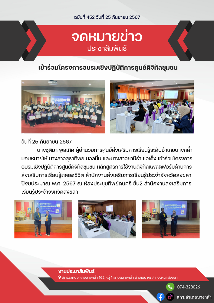 เข้าร่วมโครงการ อบรมเชิงปฏิบัติการศูนย์ดิจิทัลชุมชน หลักสูตรการใช้งานดิจิทัลแพลตฟอร์มด้านการ ส่งเสริมการเรียนรู้ตลอดชีวิต
