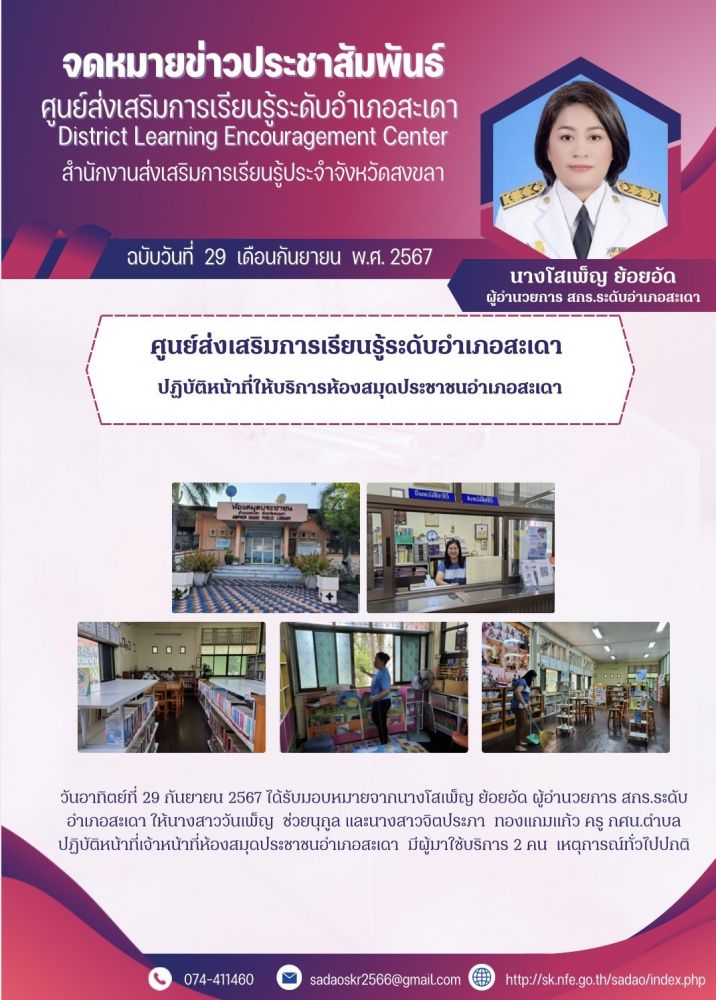 ศูนย์ส่งเสริมการเรียนรู้ระดับอำเภอสะเดา ปฏิบัติหน้าที่ให้บริการห้องสมุดประชาชนอำเภอสะเดา