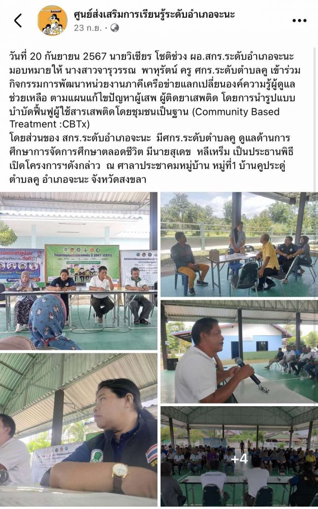 ศูนย์ สกร.ระดับอำเภอจะนะ เข้าร่วมกิจกรรมการพัฒนาหน่วยงานภาคีเครือข่ายแลกเปลี่ยนองค์ความรู้ผู้ดูแลช่วยเหลือ ตามแผนแก้ไขปัญหาผู้เสพ ผู้ติดยาเสพติด โดยการนำรูปแบบบำบัดฟื้นฟูผู้ใช้สารเสพติดโดยชุมชนเป็นฐาน (Community Based Treatment :CBTx)