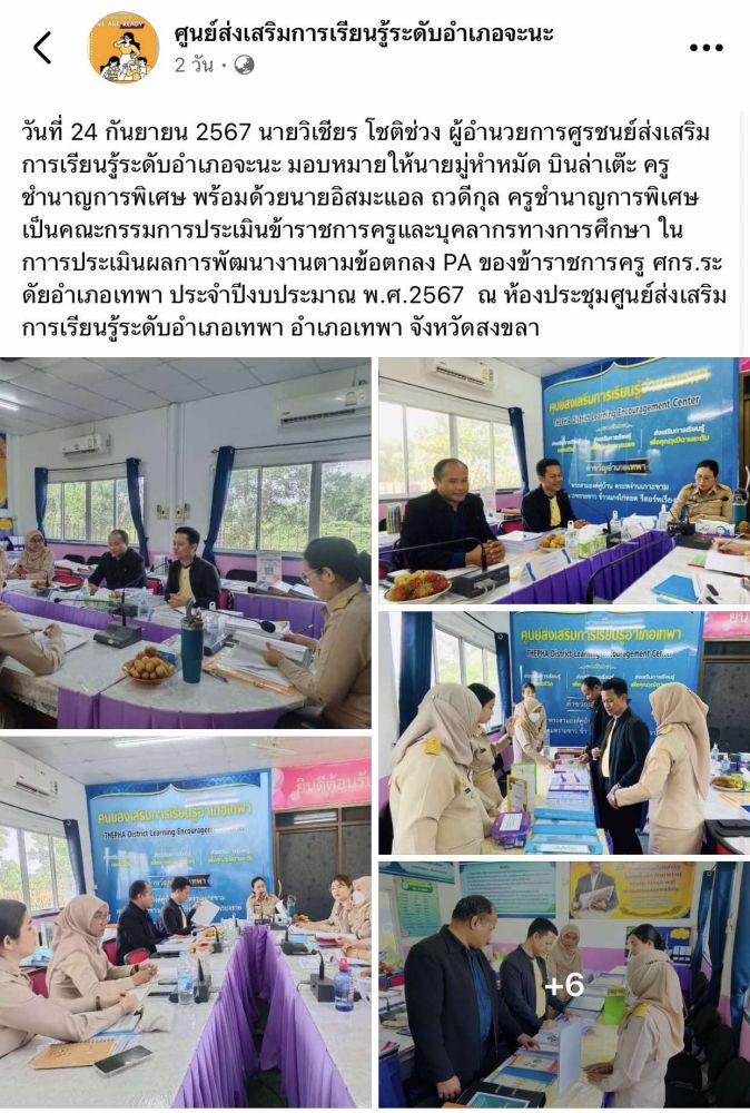 ศูนย์ สกร.ระดับอำเภอจะนะ วันที่ 24 กันยายน 2567 นายวิเชียร โชติช่วง ผู้อำนวยการศูรชนย์ส่งเสริมการเรียนรู้ระดับอำเภอจะนะ มอบหมายให้นายมู่หำหมัด บินล่าเต๊ะ ครูชำนาญการพิเศษ พร้อมด้วยนายอิสมะแอล ถวดีกุล ครูชำนาญการพิเศษ เป็นคณะกรรมการประเมินข้าราชการครูและบุคลากรทางการศึกษา ในกาารปร