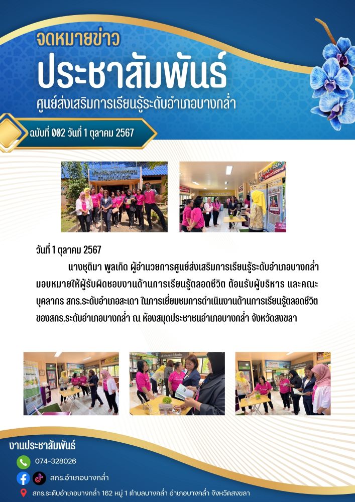 ขอต้อนรับผู้บริหาร และคณะบุคลากร สกร.ระดับอำเภอสะเดา ในการเยี่ยมชมการดำเนินงานด้านการเรียนรู้ตลอดชีวิต ของสกร.ระดับอำเภอบางกล่ำ ณ ห้องสมุดประชาชนอำเภอบางกล่ำ จังหวัดสงขลา