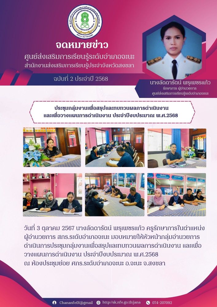 กลุ่มอำนวยการดำเนินการประชุมกลุ่มงานเพื่อสรุปและทบทวนผลการดำเนินงาน และเพื่อวางแผนการดำเนินงาน ประจำปีงบประมาณ พ.ศ.2568
