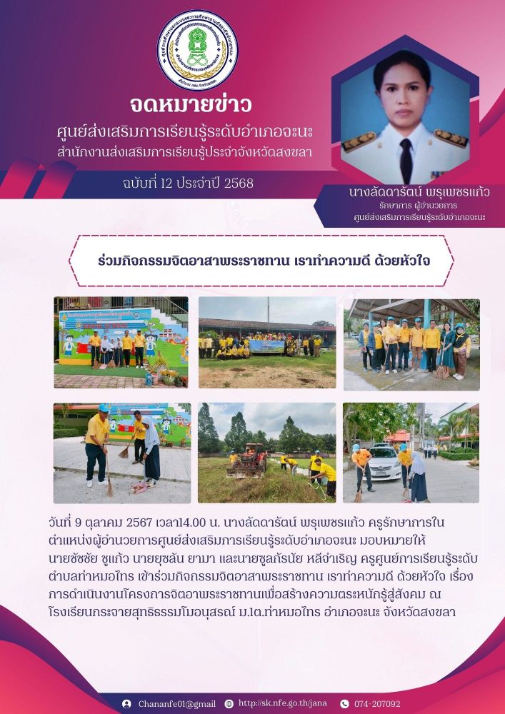 ศูนย์ สกร.ระดับอำเภอจะนะ เข้าร่วมกิจกรรมจิตอาสาพระราชทาน เราทำความดี ด้วยหัวใจ เรื่อง การดำเนินงานโครงการจิตอาพระราชทานเพื่อสร้างความตระหนักรู้สู่สังคม ณ โรงเรียนกระจายสุทธิธรรมโมอนุสรณ์ ม.1ต.ท่าหมอไทร อำเภอจะนะ จังหวัดสงขลา