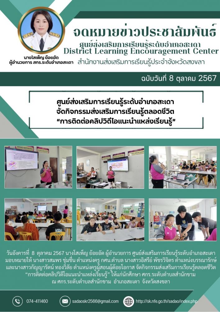 ศูนย์ส่งเสริมการเรียนรู้ระดับอำเภอสะเดา จัดกิจกรรมส่งเสริมการเรียนรู้ตลอดชีวิต “การติดต่อคลิปวิดีโอแนะนำแหล่งเรียนรู้”