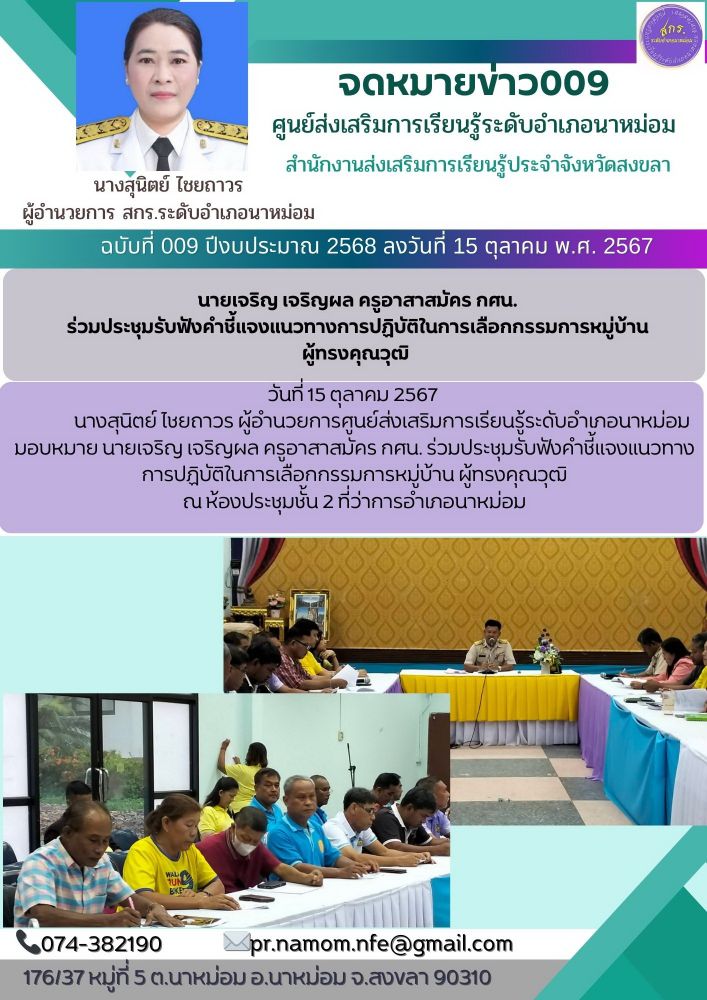 วันที่ 15 ตุลาคม 2567 นางสุนิตย์ ไชยถาวร ผู้อำนวยการศูนย์ส่งเสริมการเรียนรู้ระดับอำเภอนาหม่อม มอบหมาย นายเจริญ เจริญผล ครูอาสาสมัคร กศน. ร่วมประชุมรับฟังคำชี้แจงแนวทางการปฏิบัติในการเลือกกรรมการหมู่บ้าน ผู้ทรงคุณวุฒิ ณ ห้องประชุมชั้น 2 ที่ว่าการอำเภอนาหม่อม #จดหมายข่าวฉบับที่9 ปีงบประมาณ 2568