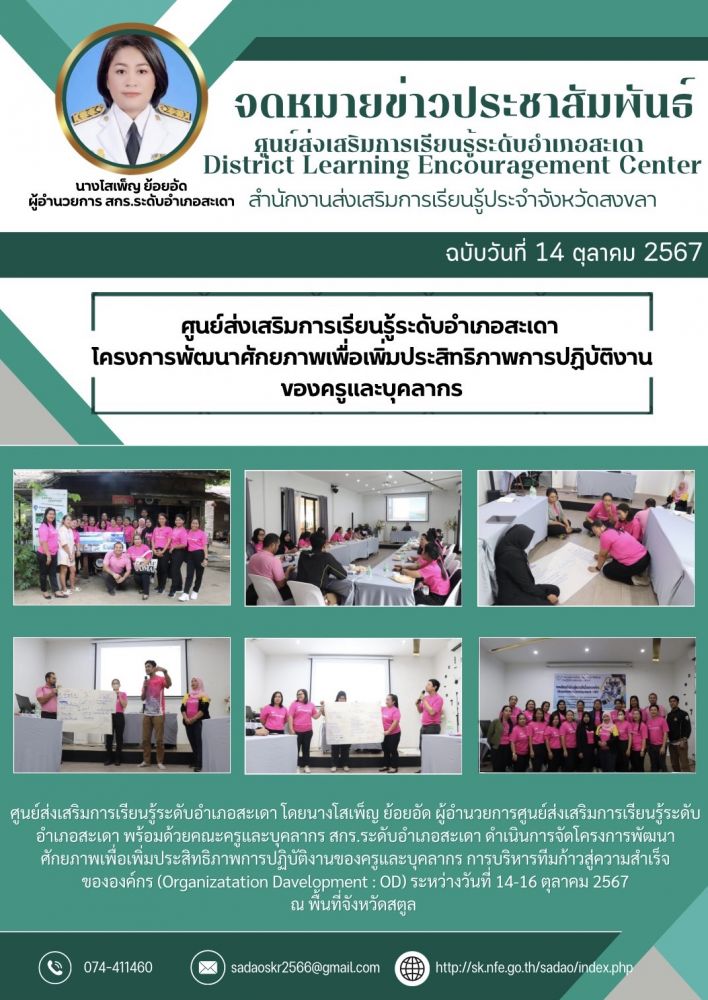 ศูนย์ส่งเสริมการเรียนรู้ระดับอำเภอสะเดา โครงการพัฒนาศักยภาพเพื่อเพิ่มประสิทธิภาพการปฏิบัติงาน ของครูและบุคลากร