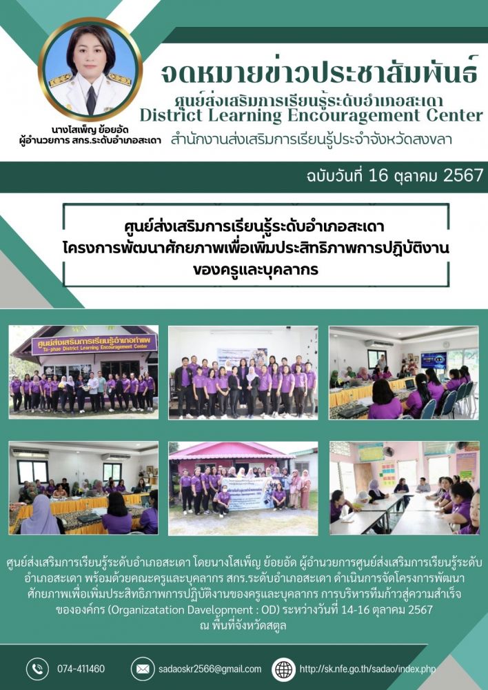 ศูนย์ส่งเสริมการเรียนรู้ระดับอำเภอสะเดา โครงการพัฒนาศักยภาพเพื่อเพิ่มประสิทธิภาพการปฏิบัติงาน ของครูและบุคลากร