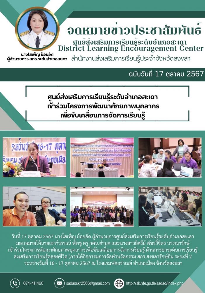 ศูนย์ส่งเสริมการเรียนรู้ระดับอำเภอสะเดา เข้าร่วมโครงการพัฒนาศักยภาพบุคลากร เพื่อขับเคลื่อนการจัดการเรียนรู้