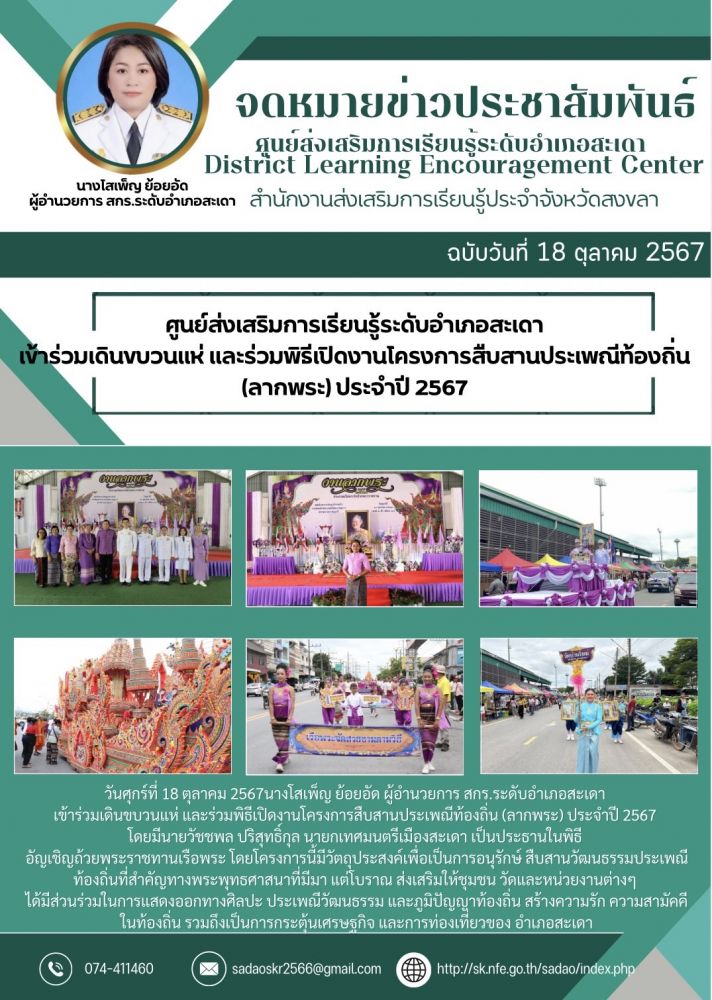 ศูนย์ส่งเสริมการเรียนรู้ระดับอำเภอสะเดา เข้าร่วมเดินขบวนแห่ และร่วมพิธีเปิดงานโครงการสืบสานประเพณีท้องถิ่น (ลากพระ) ประจำปี 2567