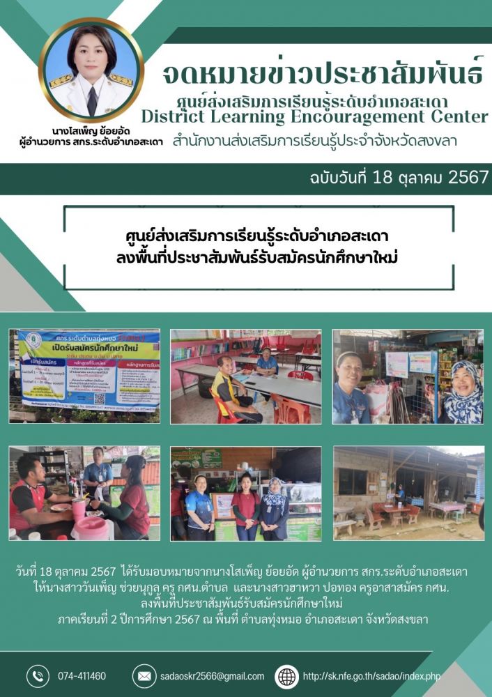ศูนย์ส่งเสริมการเรียนรู้ระดับอำเภอสะเดา ลงพื้นที่ประชาสัมพันธ์รับสมัครนักศึกษาใหม่