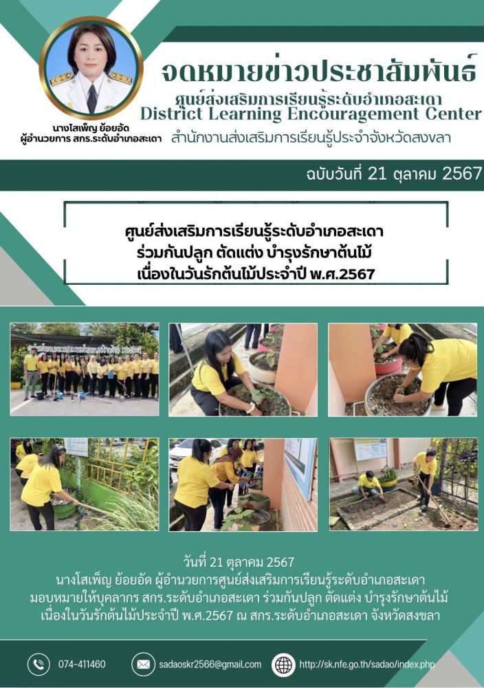ศูนย์ส่งเสริมการเรียนรู้ระดับอำเภอสะเดา ร่วมกันปลูก ตัดแต่ง บำรุงรักษาต้นไม้ เนื่องในวันรักต้นไม้ประจำปี พ.ศ.2567