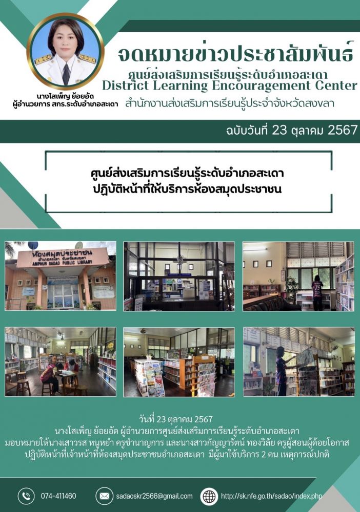 ศูนย์ส่งเสริมการเรียนรู้ระดับอำเภอสะเดา ปฏิบัติหน้าที่ให้บริการห้องสมุดประชาชน