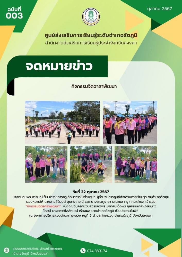 ศูนย์ สกร.ระดับอำเภอรัตภูมิ นางสิริมนต์ สุนทราภรณ์ และ นางสาวตูรายา มะดาแล ครูกศนตำบล.ท่าชะมวงนำนักศึกษาเข้าร่วมกิจกรรมจิตอาสาพัฒนาร่วมกับอำเภอรัตภูมิ องค์การบริหารส่วนตำบลท่าชะมวง เนื่องในวันคล้ายวันสวรรคตพระบาทสมเด็จพระจุลจอมเกล้าเจ้าอยู่หัว