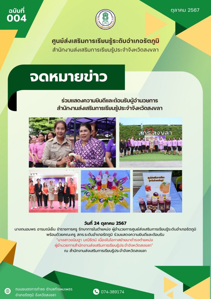 ศูนย์ สกร.ระดับอำเภอรัตภูมิ นางถนอมพร อารมณ์เย็น ข้าราชการครู รักษาการในตำแหน่ง ผู้อำนวยการศูนย์ส่งเสริมการเรียนรู้ระดับอำเภอรัตภูมิ พร้อมด้วยคณะครู สกร.ระดับอำเภอรัตภูมิ ร่วมยินดีและต้อนรับ นางสาวขนิษฐา มณีรัตน์ เนื่องในโอกาสย้ายมาดำรงตำแหน่งผู้อำนวยการสำนักงานส่งเสริมการเรียนรู้ปร