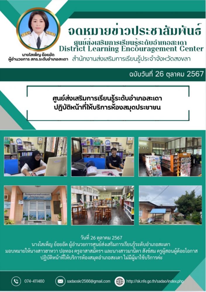 ศูนย์ส่งเสริมการเรียนรู้ระดับอำเภอสะเดา ปฏิบัติหน้าที่ให้บริการห้องสมุดประชาชน