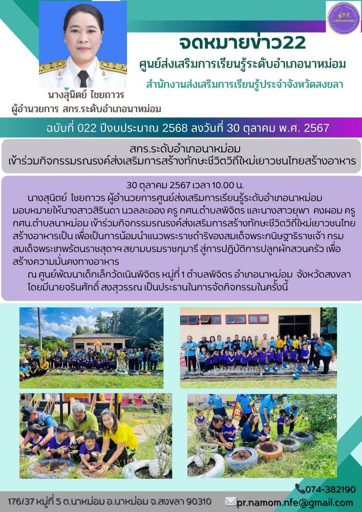 นางสุนิตย์ ไชยถาวร ผู้อำนวยการศูนย์ส่งเสริมการเรียนรู้ระดับอำเภอนาหม่อม มอบหมายให้นางสาวสิรินดา นวลละออง ครู กศน.ตำบลพิจิตร และนางสาวยุพา คงผอม ครู กศน.ตำบลนาหม่อม เข้าร่วมกิจกรรมรณรงค์ส่งเสริมการสร้างทักษะชีวิตวิถีใหม่เยาวชนไทยสร้างอาหารเป็น เพื่อเป็นการน้อมนำแนวพระราชดำริของสมเด็จพระกนิษฐาธิราชเจ้า กรมสมเด็จพระเทพรัตนราชสุดาฯ สยามบรมราชกุมารี สู่การปฏิบัติการปลูกผักสวนครัว เพื่อสร้างความมั่นคงทางอาหาร โดยจัดกิจกรรม ณ ศูนย์พัฒนาเด็กเล็กวัดเนินพิจิตร หมู่ที่ 1 ตำบลพิจิตร อำเภอนาหม่อม จังหวัดสงขลา
