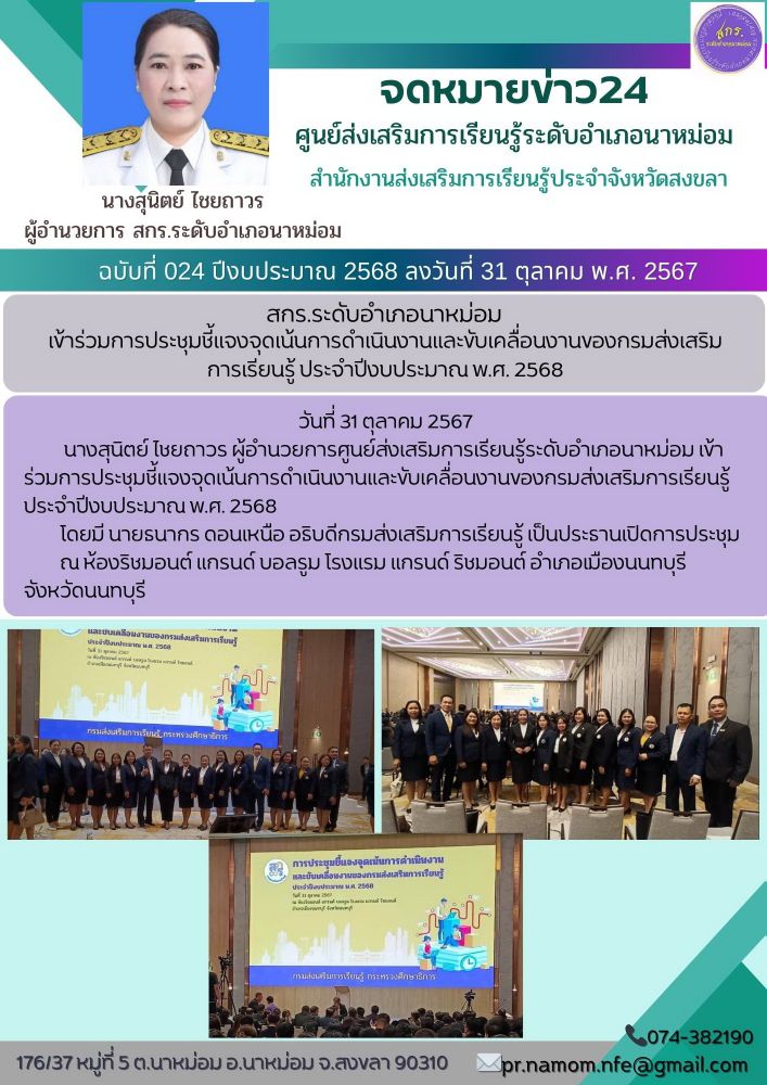 นางสุนิตย์ ไชยถาวร ผู้อำนวยการศูนย์ส่งเสริมการเรียนรู้ระดับอำเภอนาหม่อม เข้าร่วมการประชุมชี้แจงจุดเน้นการดำเนินงานและขับเคลื่อนงานของกรมส่งเสริมการเรียนรู้ ประจำปีงบประมาณ พ.ศ. 2568