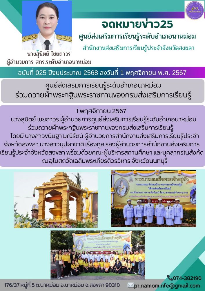 นางสุนิตย์ ไชยถาวร ผู้อำนวยการศูนย์ส่งเสริมการเรียนรู้ระดับอำเภอนาหม่อม ร่วมถวายผ้าพระกฐินพระราชทานของกรมส่งเสริมการเรียนรู้