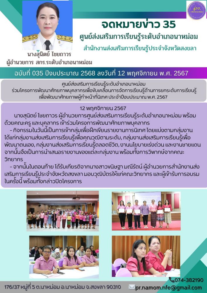นางสุนิตย์ ไชยถาวร ผู้อำนวยการศูนย์ส่งเสริมการเรียนรู้ระดับอำเภอนาหม่อม พร้อมด้วยคณะครู และบุคลากร เข้าร่วมโครงการพัฒนาศักยภาพบุคลากรเพื่อขับเคลื่อนการจัดการเรียนรู้ด้านการยกระดับการเรียนรู้เพื่อพัฒนาศักยภาพผู้ทำหน้าที่นิเทศ ประจำปีงบประมาณ พ.ศ. 2567 ระหว่างวันที่ 11-12 พฤศจิกายน 2567