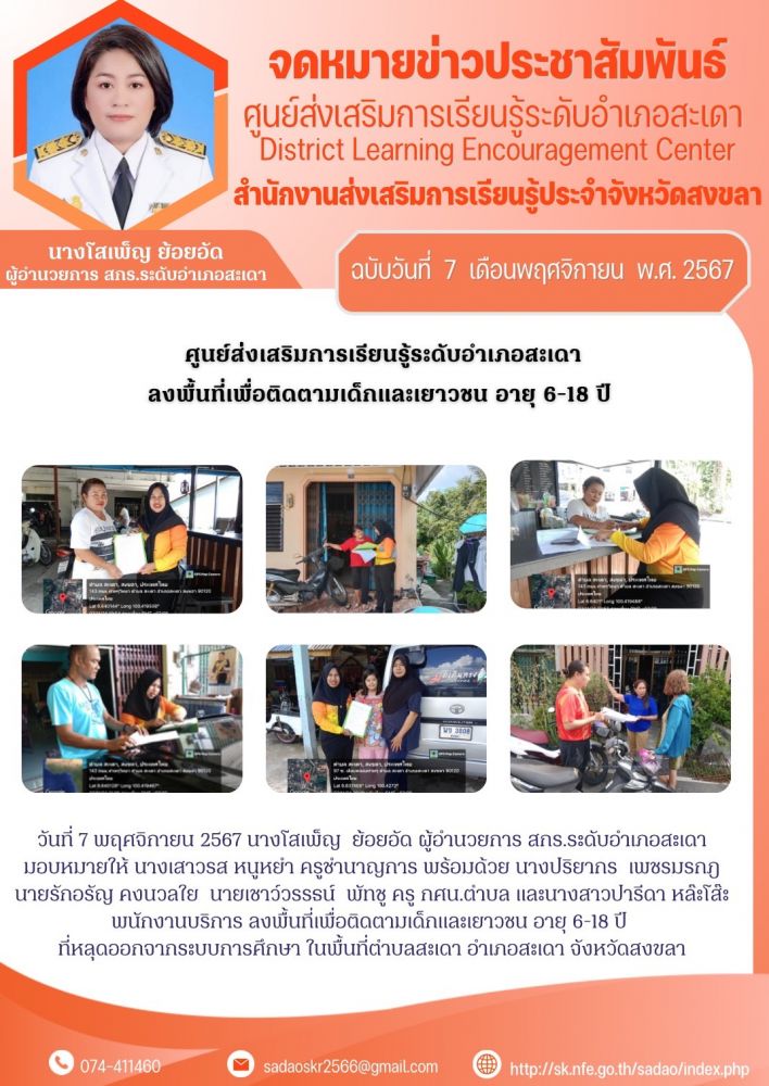 ศูนย์ส่งเสริมการเรียนรู้ระดับอำเภอสะเดา ลงพื้นที่เพื่อติดตามเด็กและเยาวชน อายุ 6-18 ปี