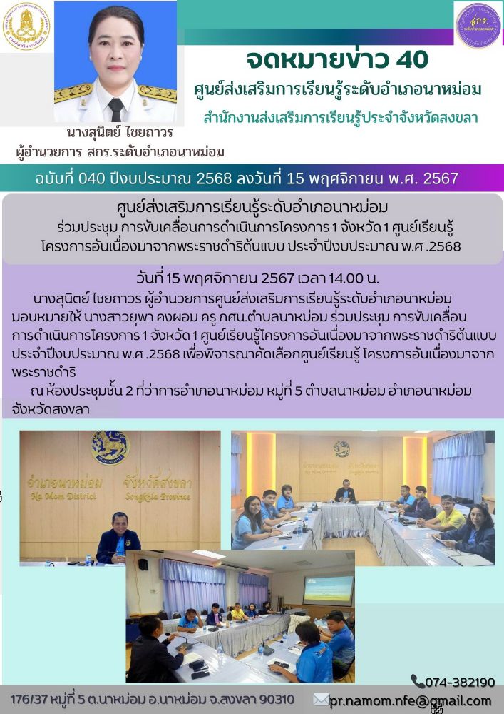 นางสุนิตย์ ไชยถาวร ผู้อำนวยการศูนย์ส่งเสริมการเรียนรู้ระดับอำเภอนาหม่อม มอบหมายให้ นางสาวยุพา คงผอม ครู กศน.ตำบลนาหม่อม ร่วมประชุม การขับเคลื่อนการดำเนินการโครงการ 1 จังหวัด 1 ศูนย์เรียนรู้โครงการอันเนื่องมาจากพระราชดำริต้นแบบ ประจำปีงบประมาณ พ..ศ 2568 เพื่อพิจารณาคัดเลือกศูนย์เรียนรู้ โครงการอันเนื่องมาจากพระราชดำริ