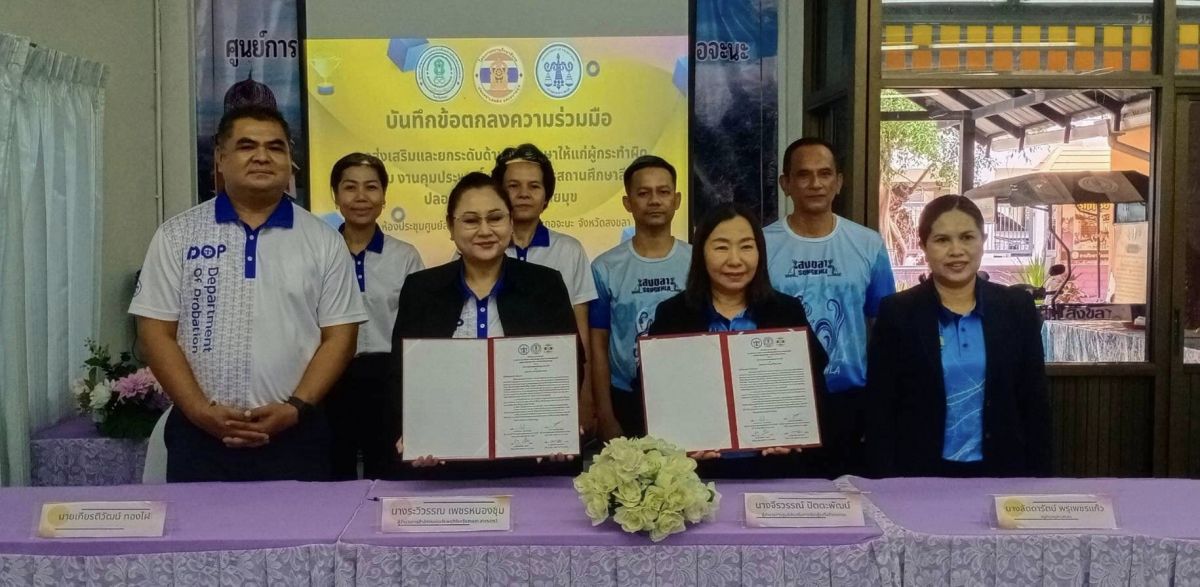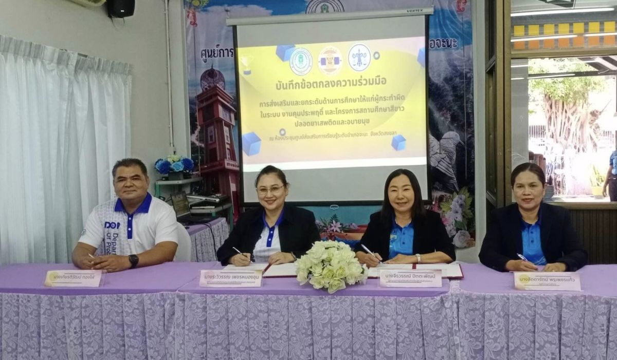 วันที่ 15 พฤศจิกายน 2567 เวลา 13.00 น. 15.30 น. นางจีรวรรณ์ ปัตตะพัฒน์ ผู้อำนวยการ สกร.ระดับอำเภอจะนะ พร้อมด้วยบุคลากร สกร.อำเภอจะนะ ร่วมบันทึกข้อตกลงความร่วมมือในการส่งเสริมและยกระดับด้านการศึกษาให้แก่ผู้กระทำผิดในระบบ งานคุมประพฤติ และโครงการสถานศึกษาสีขาว ปลอดยาเสพติดและอบายมุข กับภาคีเครือข่าย สำนักงานคุมประพฤติจังหวัดสงขลา สาขานาทวี และร่วมบันทึกข้อตกลงความร่วมมือ การดำเนินงานโครงการสถานศึกษาสีขาวปลอดยาเสพติดและอบายมุข ปีการศึกษา 2567 กับสถานศึกษา 4 แห่ง ประกอบด้วย สกร.ระดับอำเภอนาหม่อม สกร.ระดับอำเภอนาทวี สกร.ระดับอำเภอสะบ้าย้อย และ รร.วัดบ้านไร่ ในการนี้ผู้อำนวยสำนักงานคุมประพฤติจังหวัดสงขลา สาขานาทวี และผู้อำนวยการสถานศึกษาได้ร่วมแลกเปลี่ยนเกี่ยวกับการดำเนินการตามข้อตกลงความร่วมมือที่ได้บันทึก ซึ่งการดำเนินการในครั้งนี้เป็นไปด้วยความเรียบร้อย