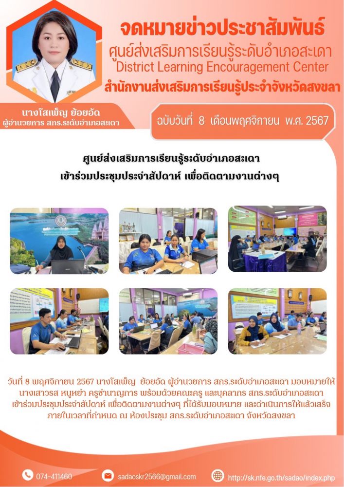 ศูนย์ส่งเสริมการเรียนรู้ระดับอำเภอสะเดา เข้าร่วมประชุมประจำสัปดาห์ เพื่อติดตามงานต่างๆ