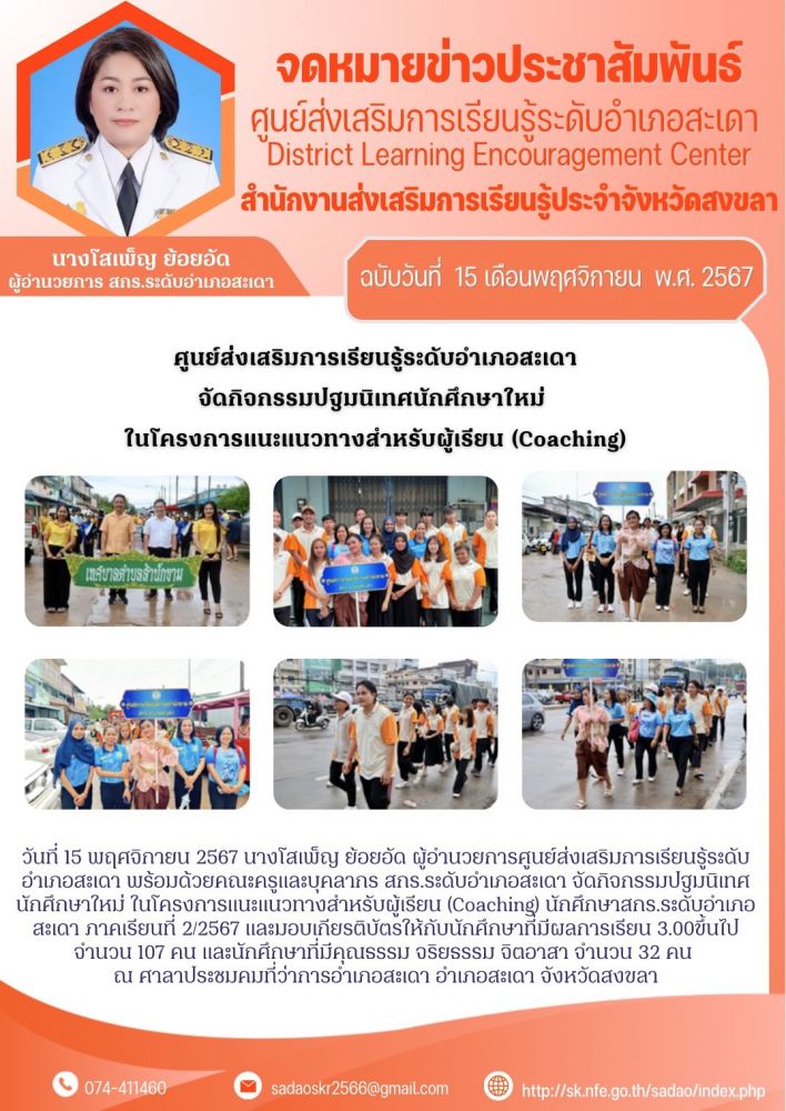 ศูนย์ส่งเสริมการเรียนรู้ระดับอำเภอสะเดา จัดกิจกรรมปฐมนิเทศนักศึกษาใหม่ ในโครงการแนะแนวทางสำหรับผู้เรียน (Coaching)