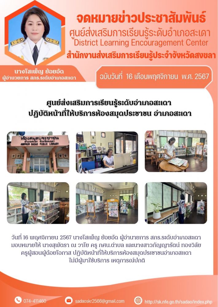 ศูนย์ส่งเสริมการเรียนรู้ระดับอำเภอสะเดา ปฏิบัติหน้าที่ให้บริการห้องสมุดประชาชน อำเภอสะเดา
