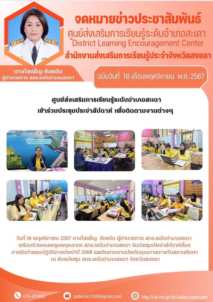 ศูนย์ส่งเสริมการเรียนรู้ระดับอำเภอสะเดา เข้าร่วมประชุมประจำสัปดาห์ เพื่อติดตามงานต่างๆ