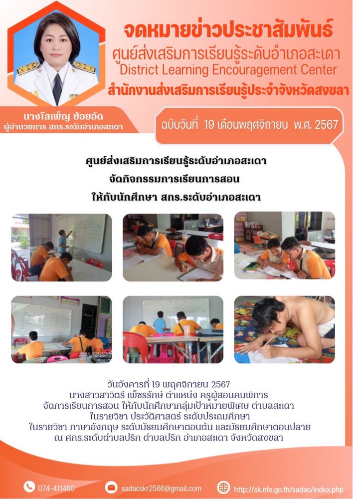 ศูนย์ส่งเสริมการเรียนรู้ระดับอำเภอสะเดา จัดกิจกรรมการเรียนการสอน ให้กับนักศึกษา สกร.ระดับอำเภอสะเดา