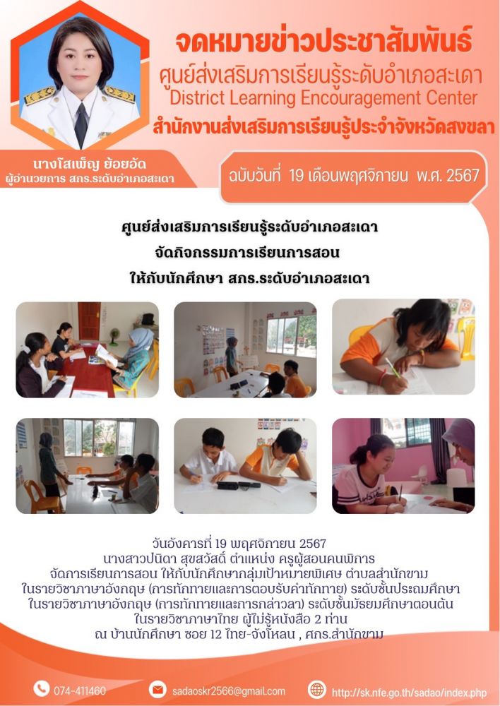 ศูนย์ส่งเสริมการเรียนรู้ระดับอำเภอสะเดา จัดกิจกรรมการเรียนการสอน ให้กับนักศึกษา สกร.ระดับอำเภอสะเดา