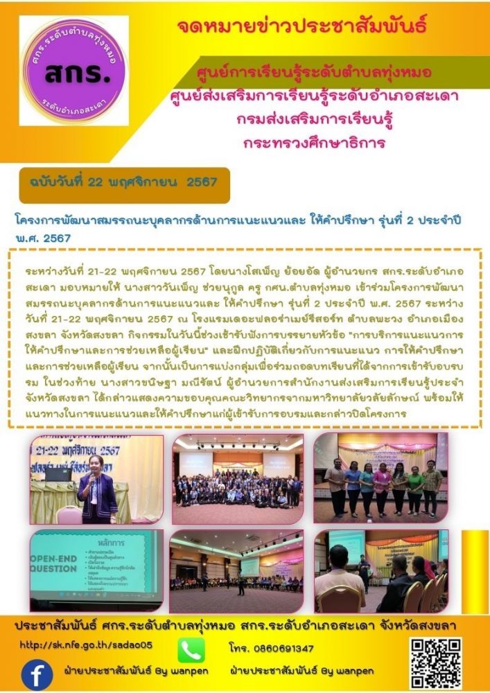 ศูนย์ส่งเสริมการเรียนรู้ระดับอำเภอสะเดา เข้าร่วมโครงการพัฒนาสมรรถนะบุคลากรด้านการแนะแนวและ ให้คำปรึกษา รุ่นที่ 2 ประจำปี พ.ศ. 2567
