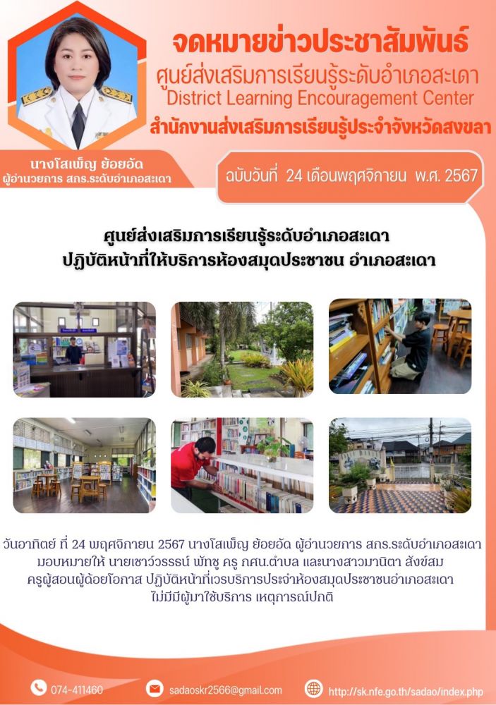 ศูนย์ส่งเสริมการเรียนรู้ระดับอำเภอสะเดา ปฏิบัติหน้าที่ให้บริการห้องสมุดประชาชน อำเภอสะเดา