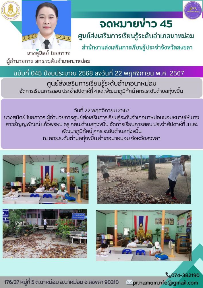 นางสุนิตย์ ไชยถาวร ผู้อำนวยการศูนย์ส่งเสริมการเรียนรู้ระดับอำเภอนาหม่อมมอบหมายให้ นางสาวธัญญพัณณ์ แก้วพรหม ครู กศน.ตำบลทุ่งขมิ้น จัดการเรียนการสอน ประจำสัปดาห์ที่ 4 และพัฒนาภูมิทัศน์ ศกร.ระดับตำบลทุ่งขมิ้น