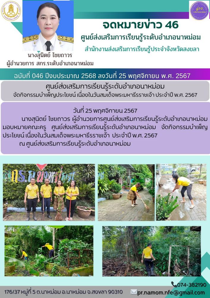 ศูนย์ส่งเสริมการเรียนรู้ระดับอำเภอนาหม่อม จัดกิจกรรมบำเพ็ญประโยชน์ เนื่องในวันสมเด็จพระมหาธีรราชเจ้า ประจำปี พ.ศ. 2567