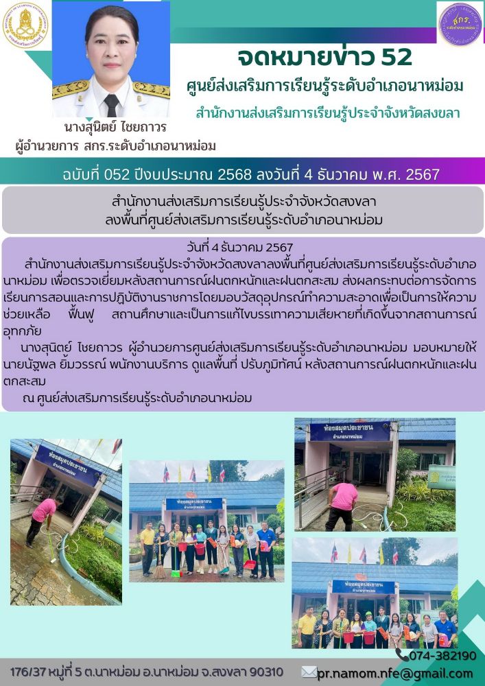 สำนักงานส่งเสริมการเรียนรู้ประจำจังหวัดสงขลาลงพื้นที่ศูนย์ส่งเสริมการเรียนรู้ระดับอำเภอนาหม่อม เพื่อตรวจเยี่ยมหลังสถานการณ์ฝนตกหนักและฝนตกสะสม ส่งผลกระทบต่อการจัดการเรียนการสอนและการปฏิบัติงานราชการ โดยมอบวัสดุอุปกรณ์ทำความสะอาด เพื่อเป็นการให้ความช่วยเหลือ ฟื้นฟู สถานศึกษาและเป็นการแก้ไขบรรเทาความเสียหายที่เกิดขึ้นจากสถานการณ์อุทกภัย