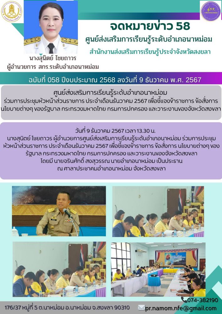 นางสุนิตย์ ไชยถาวร ผู้อำนวยการศูนย์ส่งเสริมการเรียนรู้ระดับอำเภอนาหม่อม ร่วมการประชุมหัวหน้าส่วนราชการ ประจำเดือนธันวาคม 2567 เพื่อชี้แจงข้าราชการ ข้อสั่งการ นโยบายต่างๆ ของรัฐบาล กระทรวงมหาดไทย กรมการปกครอง และวาระงานของจังหวัดสงขลา