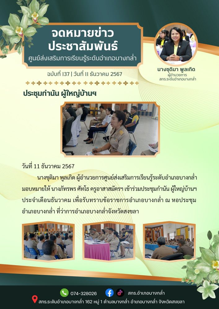 มอบหมายให้ นางภัทรพร ศัทโธ ครูอาสาสมัครฯ เข้าร่วมประชุมกำนัน ผู้ใหญ่บ้านฯ ประจำเดือนธันวาคม เพื่อรับทราบข้อราชการอำเภอบางกล่ำ ณ หอประชุมอำเภอบางกล่ำ ที่ว่าการอำเภอบางกล่ำจังหวัดสงขลา