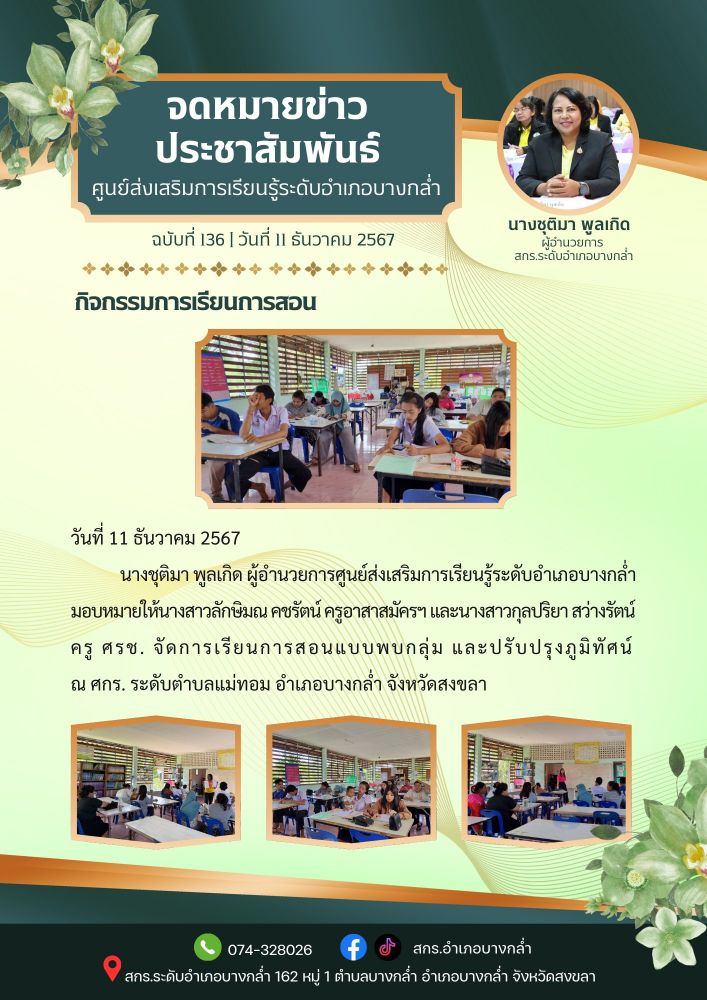 และนางสาวกุลปริยา สว่างรัตน์ ครู ศรช. จัดการเรียนการสอนแบบพบกลุ่ม และปรับปรุงภูมิทัศน์ ณ ศกร. ระดับตำบลแม่ทอม อำเภอบางกล่ำ จังหวัดสงขลา