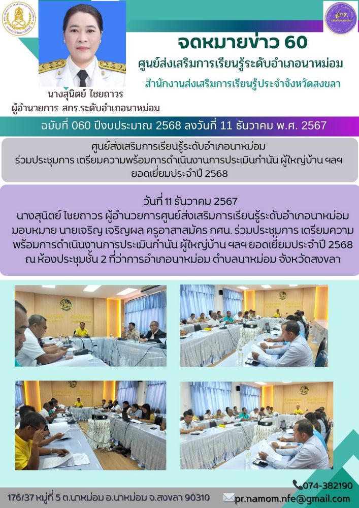นางสุนิตย์ ไชยถาวร ผู้อำนวยการศูนย์ส่งเสริมการเรียนรู้ระดับอำเภอนาหม่อม มอบหมาย นายเจริญ เจริญผล ครูอาสาสมัคร กศน. ร่วมประชุมการ เตรียมความพร้อมการดำเนินงานการประเมินกำนัน ผู้ใหญ่บ้าน ฯลฯ ยอดเยี่ยมประจำปี 2568