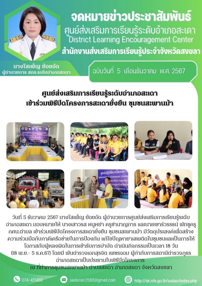 ศูนย์ส่งเสริมการเรียนรู้ระดับอำเภอสะเดา เข้าร่วมพิธีปิดโครงการสะเดายั่งยืน ชุมชนสะพานม้า